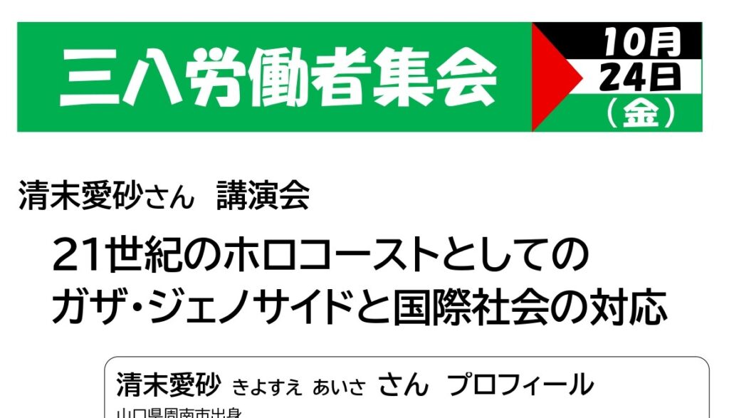 〈三八労働者集会・《清末愛砂さん講演会》のお知らせ〉『21世紀のホロコーストとしてのガザ・ジェノサイドと国際社会の対応』10月24日(金) 18:00~20:00 三八地方労働福祉会館