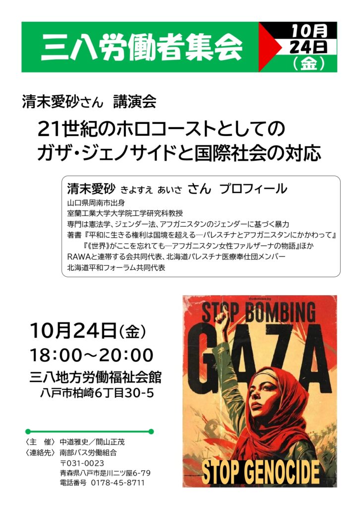 明日10/24、八戸市で三八労働者集会・清末愛砂さんの講演会。
